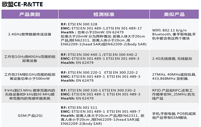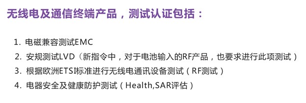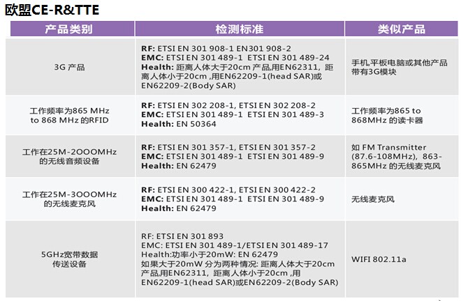 2014年5月22日,無線電設(shè)備指令(TheRadio Equipment Directive,RED)2014/53/EU正式在歐盟官方公報(OG)上公布,并于2014年6月12日生效。該指令將取代無線電與電信終端設(shè)備指令(R&TTE指令),2016年6月12日之前,成員國應(yīng)將該指令轉(zhuǎn)化為成員國法律,原R&TTE指令(1999/5/EC)也隨之作廢。2016年6月13日起,成員國應(yīng)采用新無線電設(shè)備指令(RED);2017年6月13日起,符合舊R&TTE指令的產(chǎn)品將不允許在歐盟市場上銷售。 On May 22, 2014, RED2014/53/EU Officially published in theEuropean Union's official gazette , and take effect on June 12, 2014. Thedirective will replace R&TTE directive, Before June 12, 2016, member statesshould convert the directive to member states law and the original R&TTEdirective (1999/5 / EC) is invalid. June 13, 2016, member states should adoptthe new RED; from June 13, 2017 products that meet the old R&TTE directivewill not be allowed in the eu market.