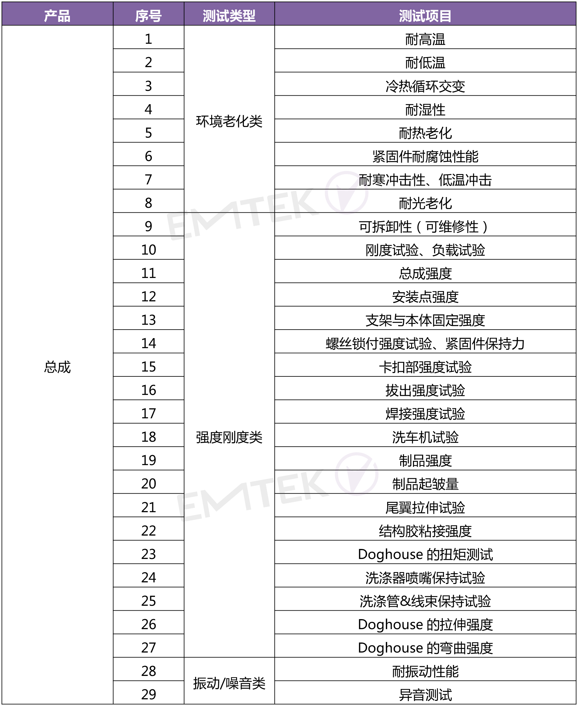考核產(chǎn)品使用過程中承受的強度和剛性、操作功能特性及耐久、振動試驗等,比如可拆卸性(可維修性)、剛度試驗、總成強度、支架與本體固定強度、螺絲鎖付強度試驗、卡扣部強度試驗、拔出強度試驗、制品強度、制品起皺量、耐振動性能等;