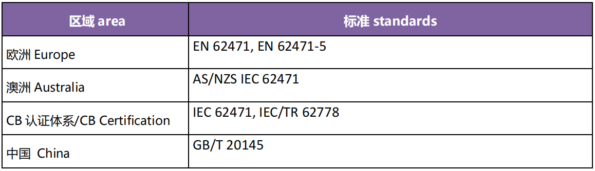 危害、視網(wǎng)膜藍(lán)光危害、視網(wǎng)膜熱危害、視網(wǎng)膜熱微弱危害。為評(píng)估燈和燈系統(tǒng)相關(guān)的光輻射危害,明確規(guī)定曝輻射限值,包括輻射照度,輻射亮度。根據(jù)測(cè)試數(shù)據(jù)對(duì)產(chǎn)品進(jìn)行危害分級(jí),包括豁免級(jí),低危害,中等危害,高危害級(jí)別。
