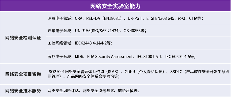 信測標準網(wǎng)絡安全實驗室位于深圳市南山區(qū)信測標準南山檢測基地,屬于信測標準網(wǎng)絡安全產(chǎn)線下屬單位,實驗室由擁有多年網(wǎng)絡安全經(jīng)驗的網(wǎng)絡安全專家及項目經(jīng)驗豐富的測試工程師組成,依據(jù)ISO 17025標準建設,具備符合資質(zhì)要求的標準化環(huán)境、設備、人員及流程。目前已具備智能消費電子(含無線電設備)、汽車及汽車電子、醫(yī)療電子、工業(yè)控制網(wǎng)絡等四大垂直領域的產(chǎn)品網(wǎng)絡安全檢測與認證能力,同時還具備半導體、物聯(lián)網(wǎng)設備制造企業(yè)的OT端網(wǎng)絡安全體系項目咨詢、安全技術服務等相關業(yè)務的能力。