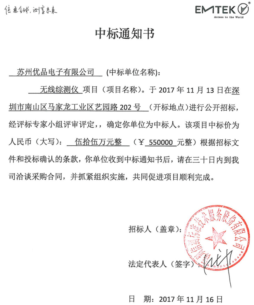 蘇州優(yōu)品中標(biāo)通知書