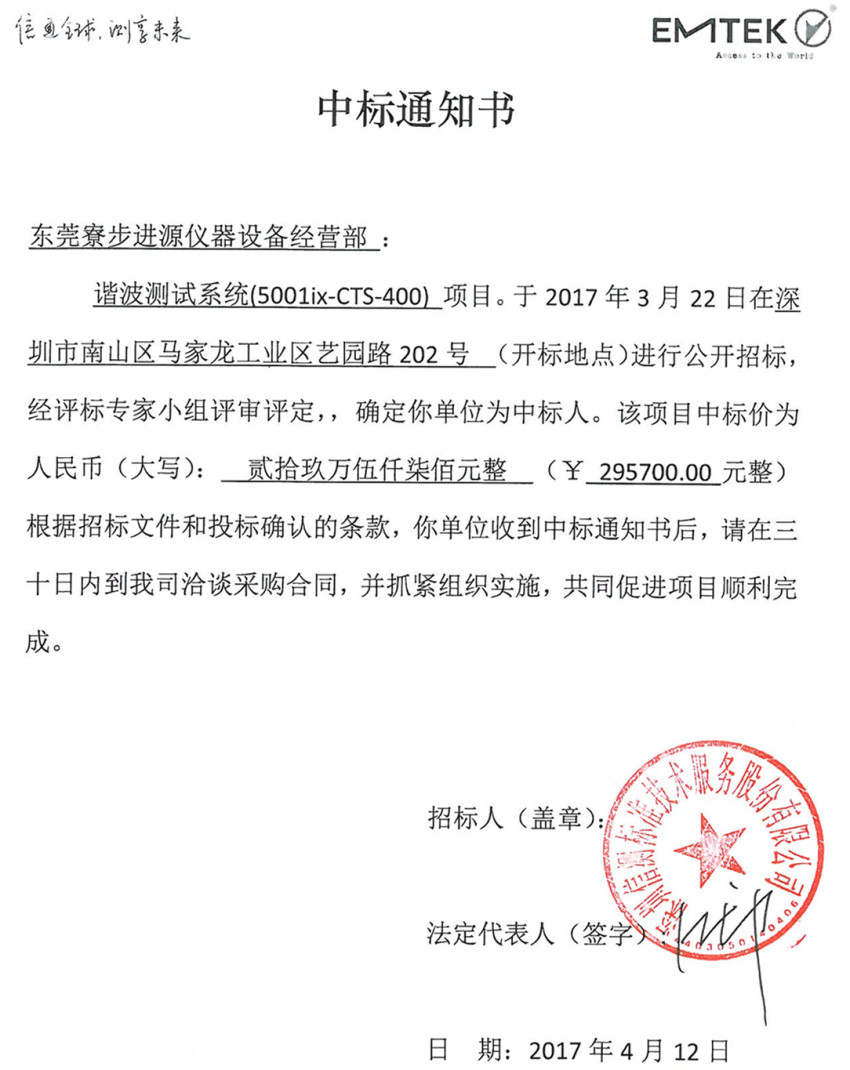 進源儀器設(shè)備中標(biāo)通知書