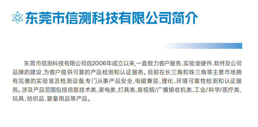 實(shí)驗(yàn)室總面積8000平方米,擁有可靠性檢測(cè)中心、玩具檢測(cè)中心,燈具檢測(cè)中心,電池檢測(cè)中心,鞋材與紡織品檢測(cè)中心,汽車電子檢測(cè)中心,音視頻產(chǎn)品檢測(cè)中心,信息技術(shù)設(shè)備檢測(cè)中心,電源檢測(cè)中心,EMC/RF檢測(cè)中心共10個(gè)專業(yè)檢測(cè)中心,檢測(cè)基地已有專業(yè)成套檢驗(yàn)檢測(cè)設(shè)備1200套,獲得了CNAS,CMA,A2LA,F(xiàn)CC等權(quán)威機(jī)構(gòu)的認(rèn)可,能夠?yàn)殡娮与姎猱a(chǎn)品,日用消費(fèi)品,汽車電子產(chǎn)品提供一站式的產(chǎn)品全生命周期的測(cè)試認(rèn)證服務(wù)解決方案。