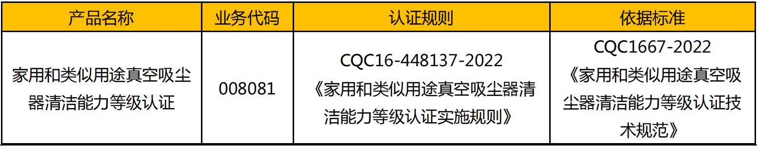 2022 年 8 月 25 日,中國質(zhì)量認證中心(CQC)發(fā)布關(guān)于開通家用和類似用途真空吸塵器清潔能力等級