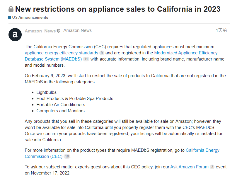 平臺商家在銷售上述商品時,若未在CEC的MAEDbS正確注冊,商品將無法通過亞馬遜在加利福尼亞州銷售。只有亞馬遜確認商品已完成注冊后,商品才會自動恢復,允許在加利福尼亞州銷售。