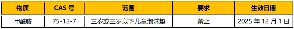 2023 年1 月26 日,美國紐約州發(fā)布草案 S02983《無甲酰胺兒童產品法》,提議禁止在三歲及三歲以下兒童泡沫墊產品中使用甲酰胺。如法案通過,該要求將于2025 年 12 月1 日正式實施。