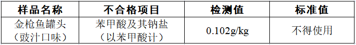 《食品安全國家標(biāo)準(zhǔn) 食品添加劑使用標(biāo)準(zhǔn)》(GB 2760—2014)中規(guī)定,苯甲酸及其鈉鹽(以苯甲酸計)在水產(chǎn)動物類罐頭中不得使用;《食品安全國家標(biāo)準(zhǔn) 食品添加劑使用標(biāo)準(zhǔn)》(GB 2760—2014)中規(guī)定,苯甲酸及其鈉鹽(以苯甲酸計)在醬鹵肉制品中不得使用。