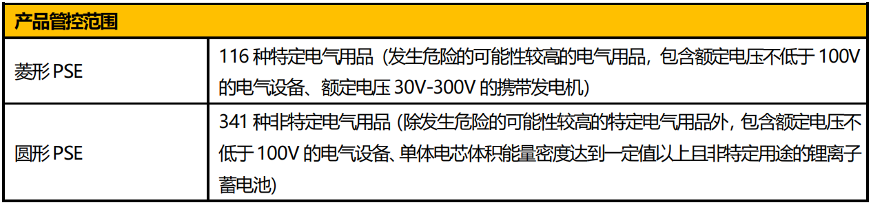 PSE 是日本政府針對(duì)電子產(chǎn)品的強(qiáng)制性安全認(rèn)證。根據(jù)日本經(jīng)濟(jì)產(chǎn)業(yè)省(Ministry of Economy, Trade and Industry,METI)的電氣用品安全法要求,通用電氣設(shè)備、額定電壓30V-300V 的攜帶發(fā)電機(jī)、單體電芯體積能量密度達(dá)到一定值以上,且非特定用途的鋰離子蓄電池,在出口至日本銷(xiāo)售前需取得 PSE 認(rèn)證。