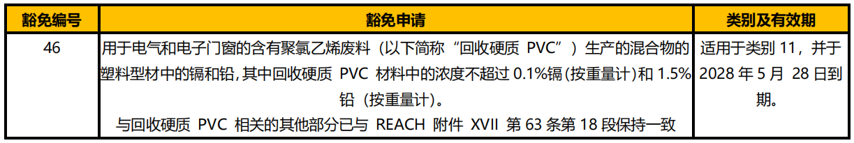 此外,該豁免的范圍與 REACH 附件 XVII 第 63 條中有關(guān) PVC2 中鉛的規(guī)定對回收 PVC 中鉛的減損一致。因此,EC 已授予 RoHS 指令附件 I 第 11 類的豁免。表 A 豁免詳情。