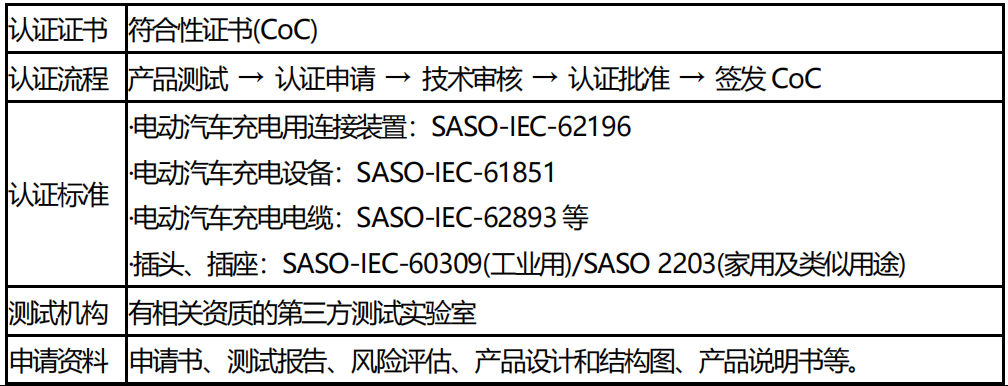 沙特阿拉伯為實(shí)現(xiàn)本國(guó)“2030 愿景”,減少碳排放,大力鼓勵(lì)電動(dòng)汽車產(chǎn)業(yè)的發(fā)展并支持投資電動(dòng)汽車基礎(chǔ)設(shè)施建設(shè),逐漸成為電動(dòng)汽車及充電設(shè)備企業(yè)出口新興潛力市場(chǎng)。2019 年以來,沙特相繼發(fā)布了電動(dòng)汽車相關(guān)的技術(shù)法規(guī)以及電動(dòng)汽車充電設(shè)備認(rèn)證要求,以下為電動(dòng)汽車充電設(shè)備出口沙特阿拉伯的強(qiáng)制性認(rèn)證要求。