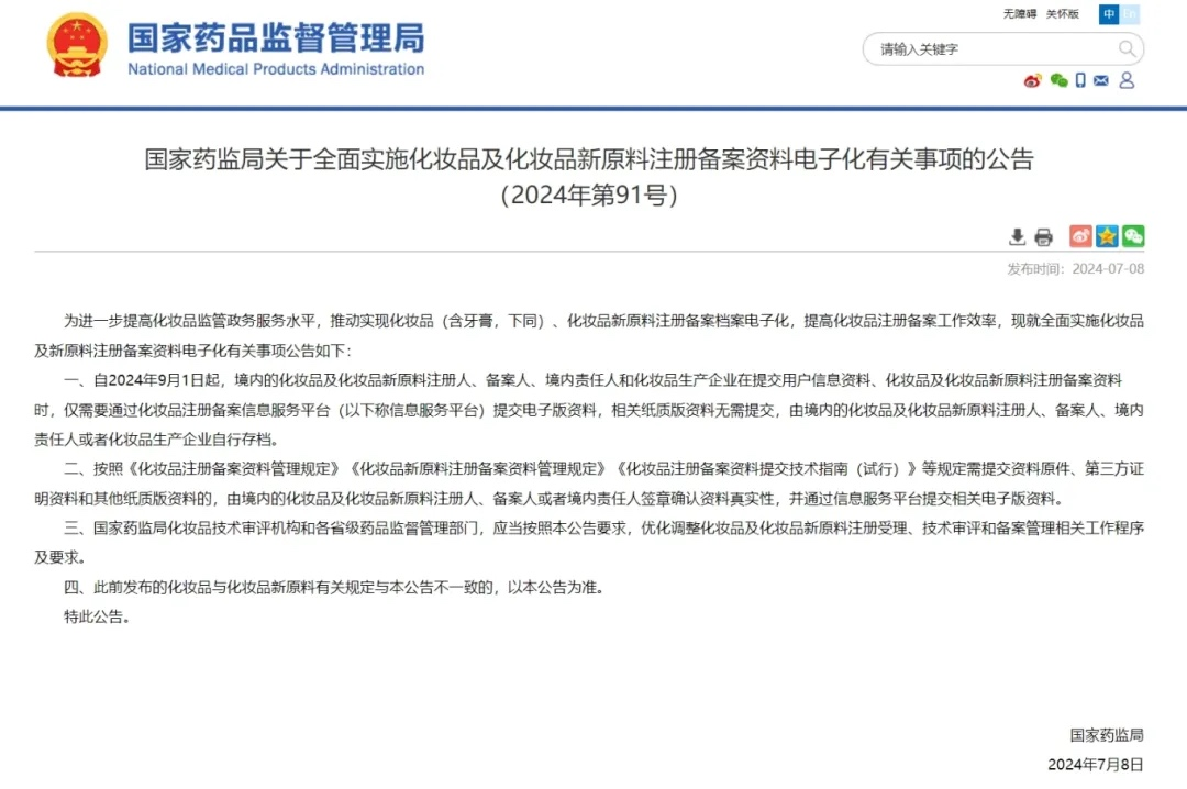 2024年7月8日,為進一步提高化妝品監(jiān)管政務(wù)服務(wù)水平,國家藥監(jiān)局發(fā)布《關(guān)于全面實施化妝品及化妝品新原料注冊備案資料電子化有關(guān)事項的公告》(2024年第91號)。