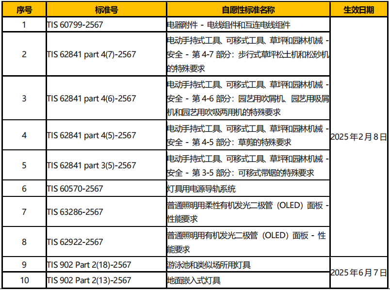 泰國(guó)工業(yè)標(biāo)準(zhǔn)協(xié)會(huì)(TISI)于 2025 年2 月 7 日更新TIS 標(biāo)準(zhǔn)清單,新增多項(xiàng)自愿性標(biāo)準(zhǔn),見表 3。