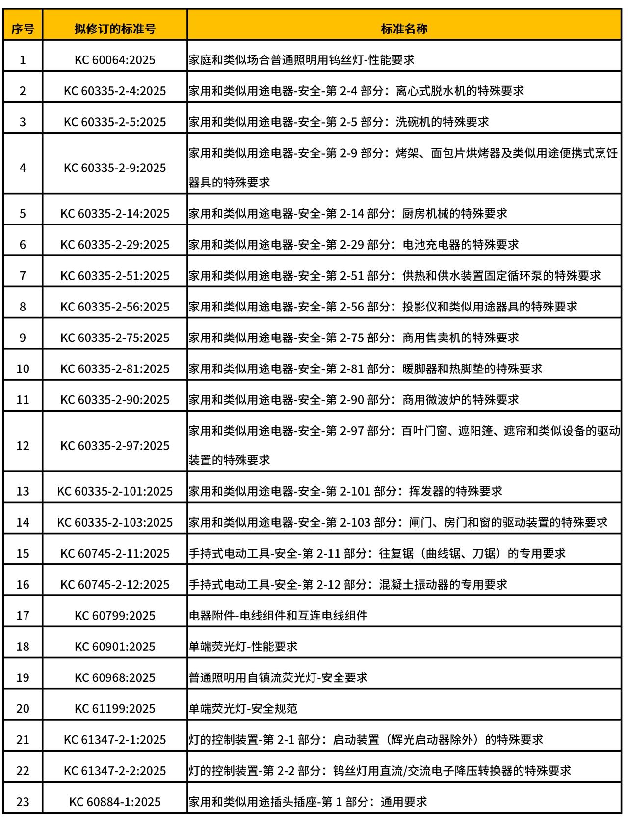 本次修訂范圍廣泛,涵蓋了 KC 系列標(biāo)準(zhǔn)中的 23 個(gè)重要類別,見表 1,包括 KC 60332 系列、KC 60745系列等多個(gè)關(guān)鍵電器安全標(biāo)準(zhǔn)。修訂內(nèi)容主要集中在三個(gè)方面:一是對(duì)技術(shù)要求進(jìn)行更新,重點(diǎn)改進(jìn)產(chǎn)品材料、結(jié)構(gòu)和安全性能指標(biāo);二是對(duì)測(cè)試方法進(jìn)行優(yōu)化和補(bǔ)充,確保評(píng)估更加準(zhǔn)確;三是針對(duì)特定產(chǎn)品的分類和適用范圍進(jìn)行調(diào)整,使標(biāo)準(zhǔn)更具針對(duì)性。