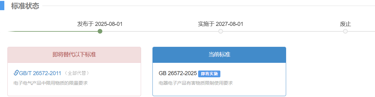 2025 年 8 月 1 日,國家市場監(jiān)督管理總局(國家標準化管理委員會)發(fā)布 2025 年第 18 號標準公告,批準發(fā)布 35 項強制性國標,其中包括中國 RoHS 第一份強制性國標《電器電子產(chǎn)品有害物質(zhì)限制使用要求》(GB 26572-2025),該標準將于 2027 年 8 月 1 日正式實施,并全面替代原有推薦性國標 GB/T 26572-2011。