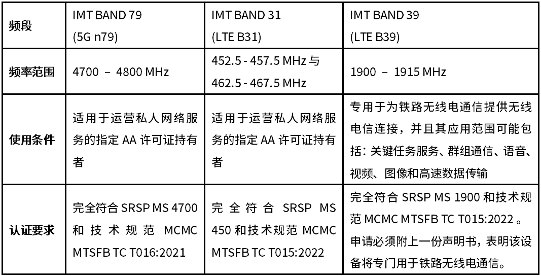 本次修訂的要點(diǎn)是CRC將Band 7 (2500-2570 MHz/ 2620-2690 MHz)和Band 38 (2570-2620 MHz)劃分用于5G NR技術(shù),并規(guī)定了適用的技術(shù)標(biāo)準(zhǔn)。同時(shí),通函要求相關(guān)設(shè)備需符合3GPP及SAR要求。