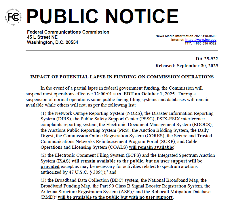 10月1日起,美國聯(lián)邦通信委員會(huì)(FCC)因聯(lián)邦政府資金未到位,正式啟動(dòng)了應(yīng)急停擺程序。受此影響,暫停運(yùn)營期間所有FCC ID認(rèn)證的簽發(fā)工作均已暫停。此次暫停屬于不可抗力事件,具體的恢復(fù)運(yùn)營時(shí)間需等待FCC的官方進(jìn)一步通知。電子產(chǎn)品上市節(jié)奏將被影響,哪些環(huán)節(jié)被按下暫停鍵?您的認(rèn)證、庫存、銷售會(huì)受多大波及?下文帶您一起關(guān)注。