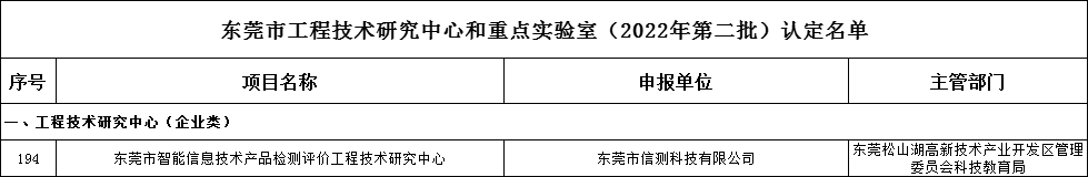 近日,東莞市科學(xué)技術(shù)局發(fā)布《市科技局關(guān)于認定東莞市工程技術(shù)研究中心和重點實驗室(2022年第二批)的通知》,東莞市信測科技有限公司申報的東莞市智能信息技術(shù)產(chǎn)品檢測評價工程技術(shù)研究中心被正式認定為東莞市工程技術(shù)研究中心。